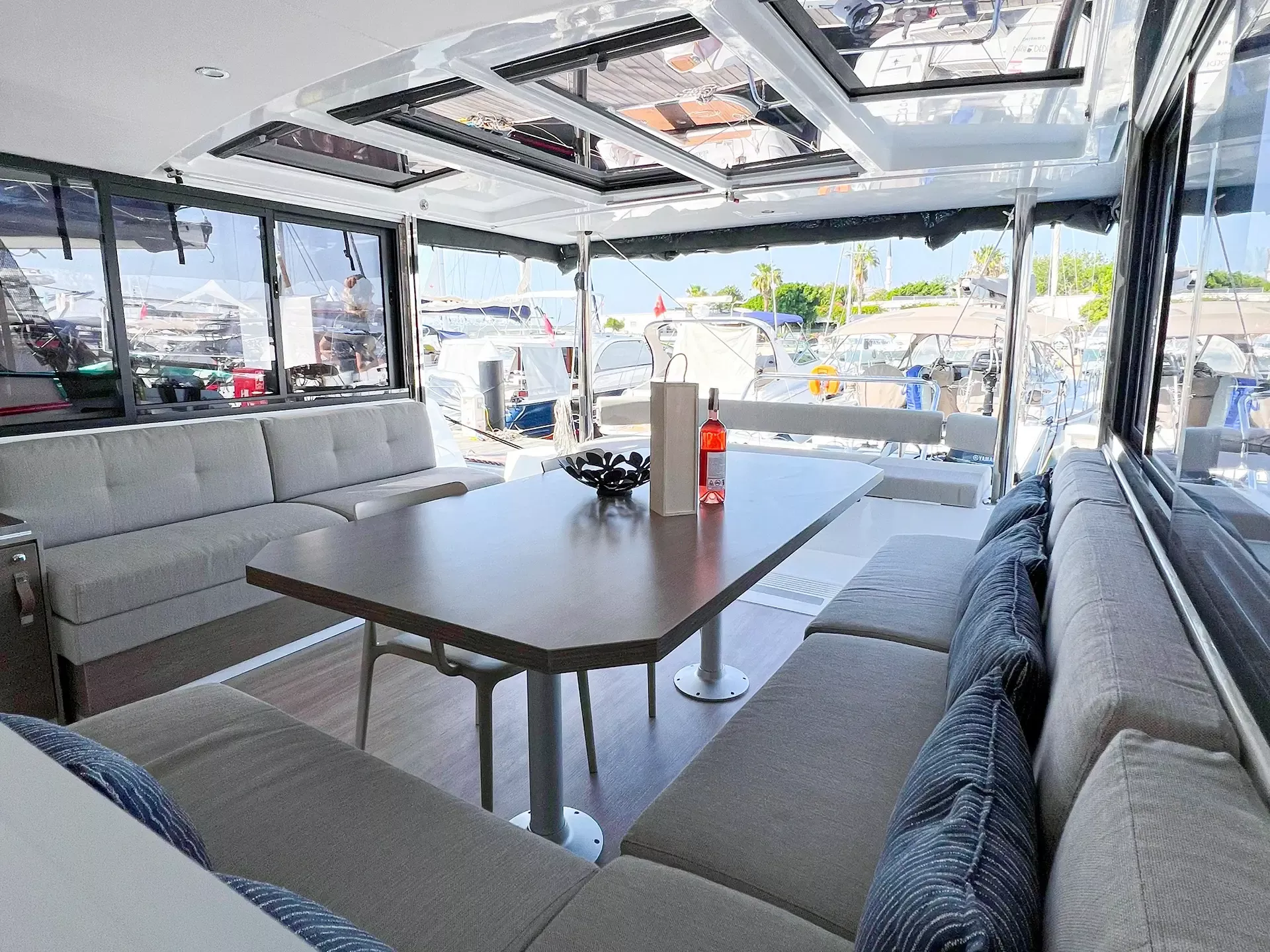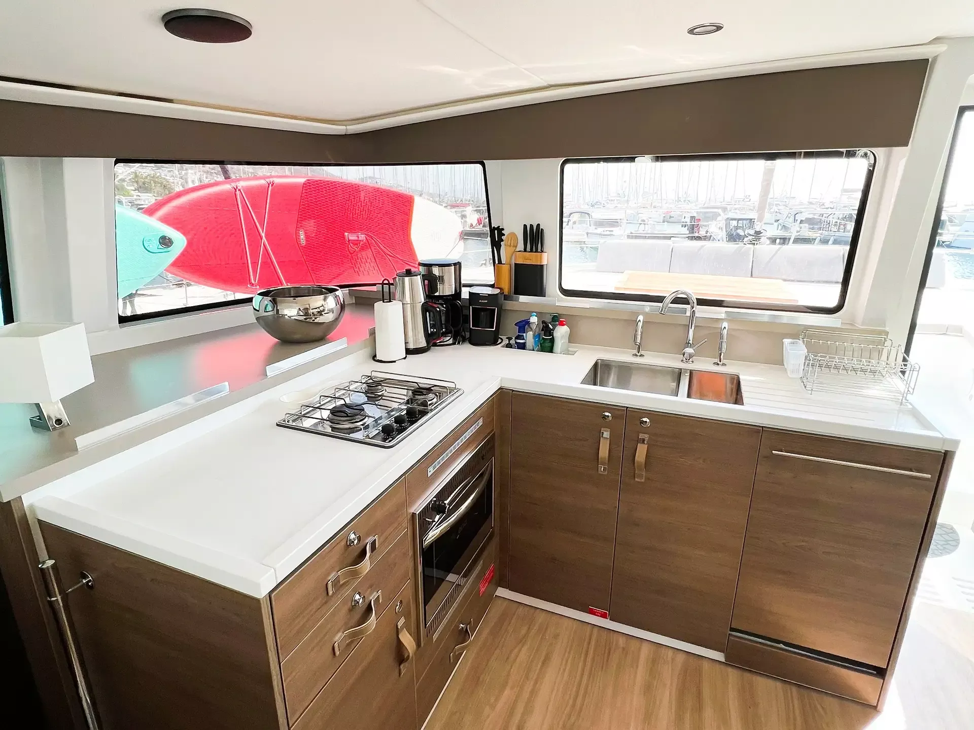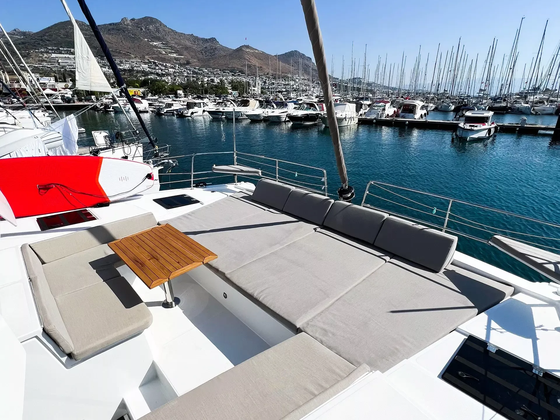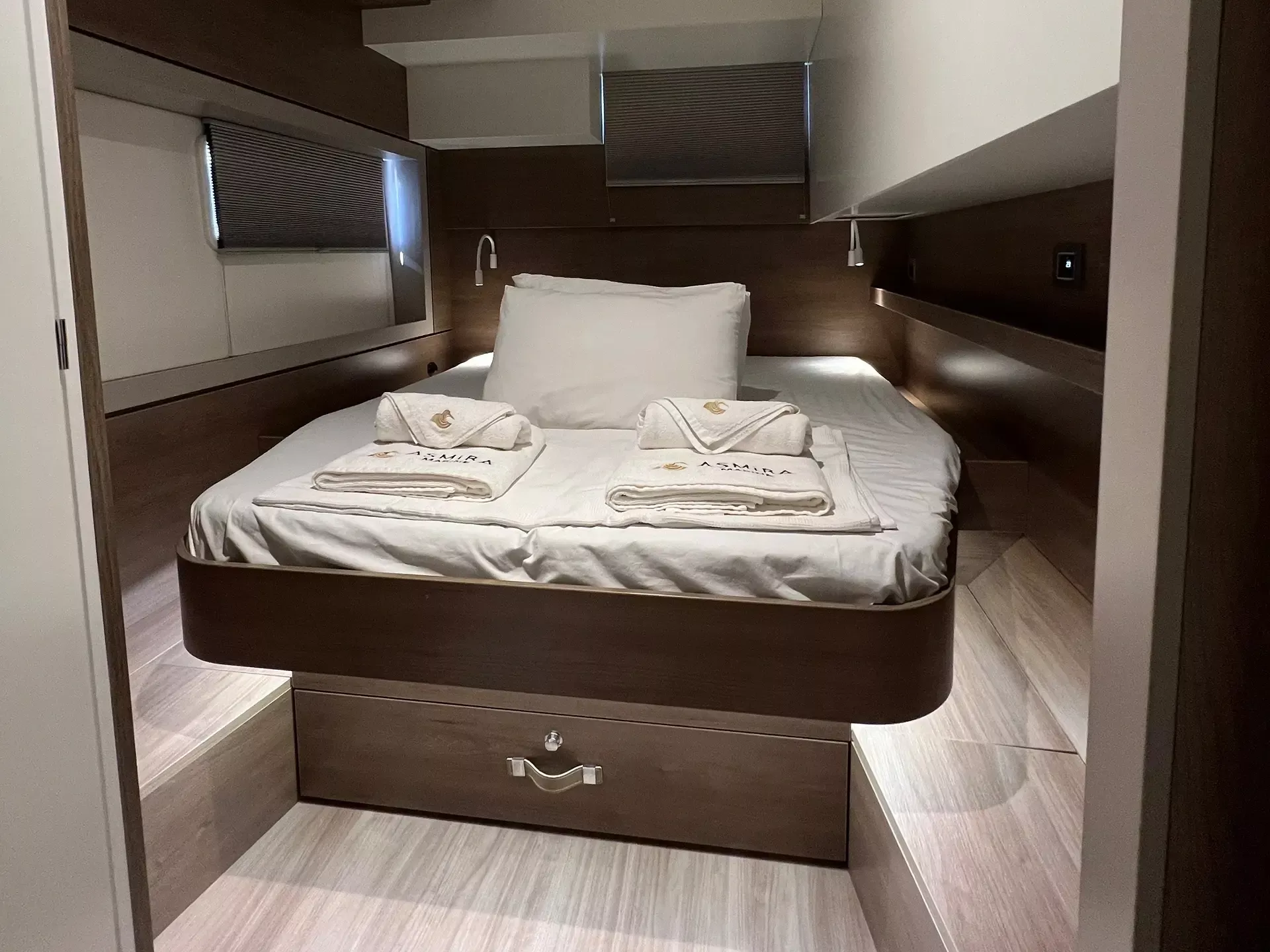 The Bali 4.4 “Leonora,” built in 2024, is a state-of-the-art catamaran designed for luxurious sailing experiences. With a hull length of 13.09 meters and a beam of 7.4 meters, it’s powered by twin Nanni 57 HP engines. This yacht features 4+1 cabins, accommodating up to 10 guests with 4+1 heads and 4 showers.